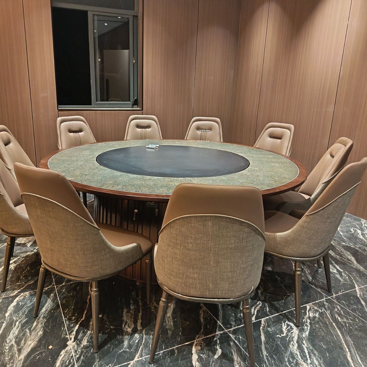 Modern minimalist round wooden dining table with rock slab, suitable for 15 to 20 people, ideal for restaurants and banquet events, sourced directly from the factory.